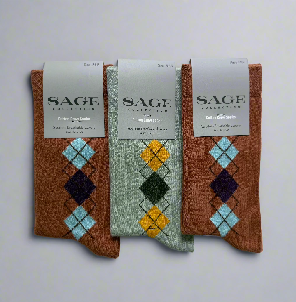 Step into breathable luxury with our Premium Cotton Crew Socks 3-Pack from Sage Collection—crafted for softness, breathability, and all-season wear. Each pack features an elegant mix of earthy tones like Sage Green and Mocha Mousse, paired in thoughtful assorted combinations. With a vintage argyle-inspired pattern, these medium-thin, stretchable socks blend timeless style with everyday function. Designed with a seamless toe for irritation-free comfort and a subtle side detail to help distinguish left from right—no more awkward toe bunching or wearing them the wrong way! Made with OEKO-TEX® certified materials to support a healthier planet and more mindful fashion choices.